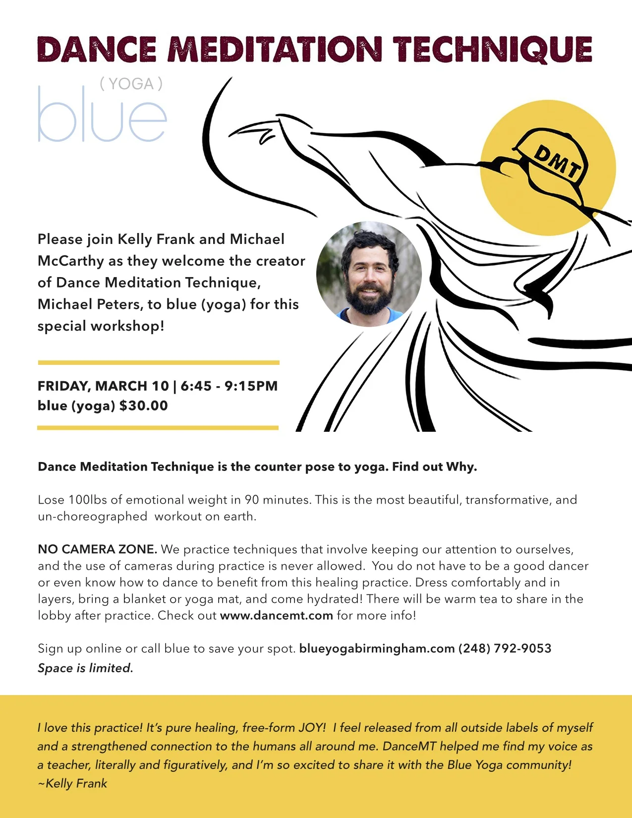 Join blue teachers Kelly Frank and Michael McCarthy as they welcome the creator of Dance Meditation Technique, Michael Peters to blue(yoga) for this special workshop.